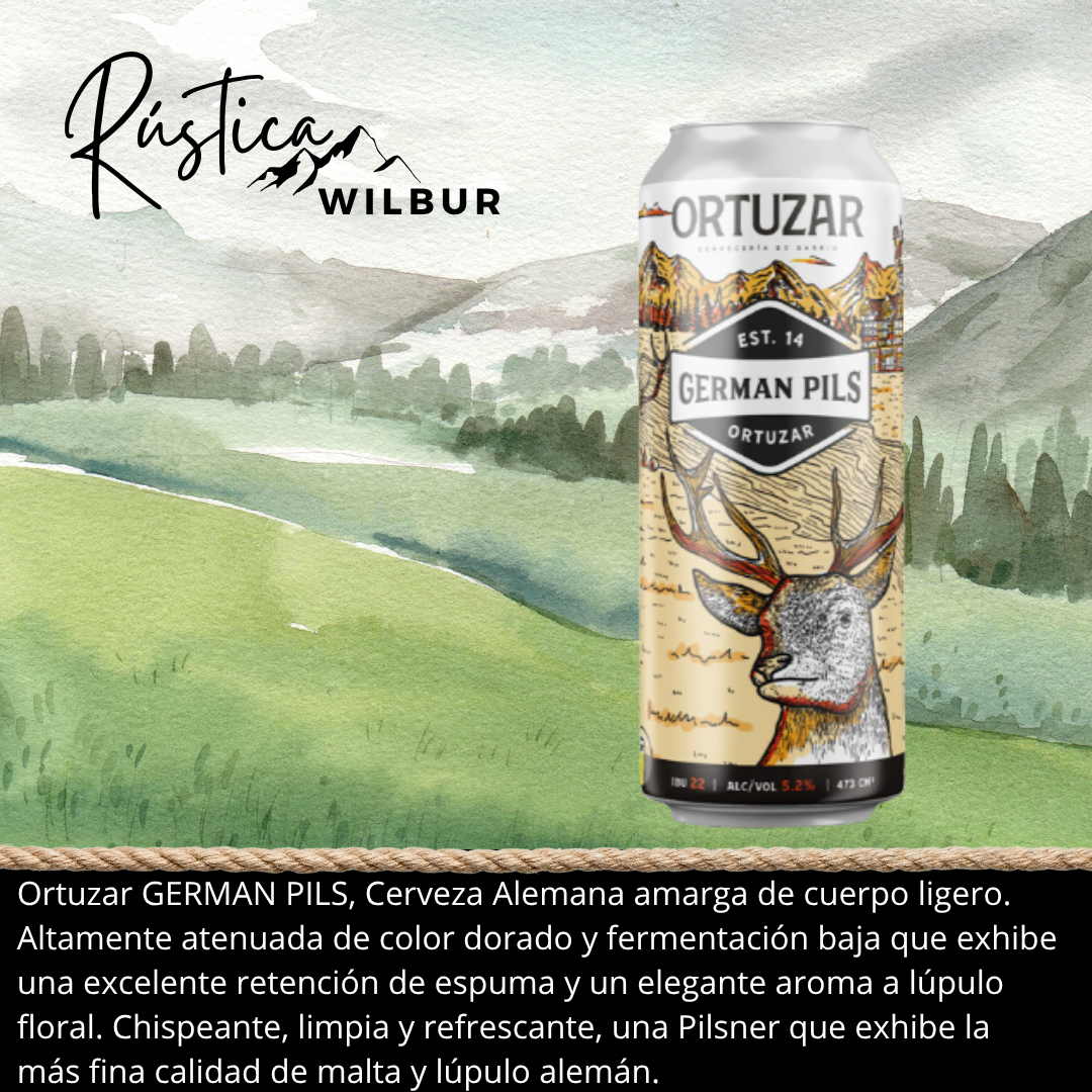 Ortuzar GERMAN PILS, Cerveza Alemana amarga de cuerpo ligero. Altamente atenuada de color dorado y fermentación baja que exhibe una excelente retención de espuma y un elegante aroma a lúpulo floral. Chispeante, limpia y refrescante, una Pilsner que exhibe la
